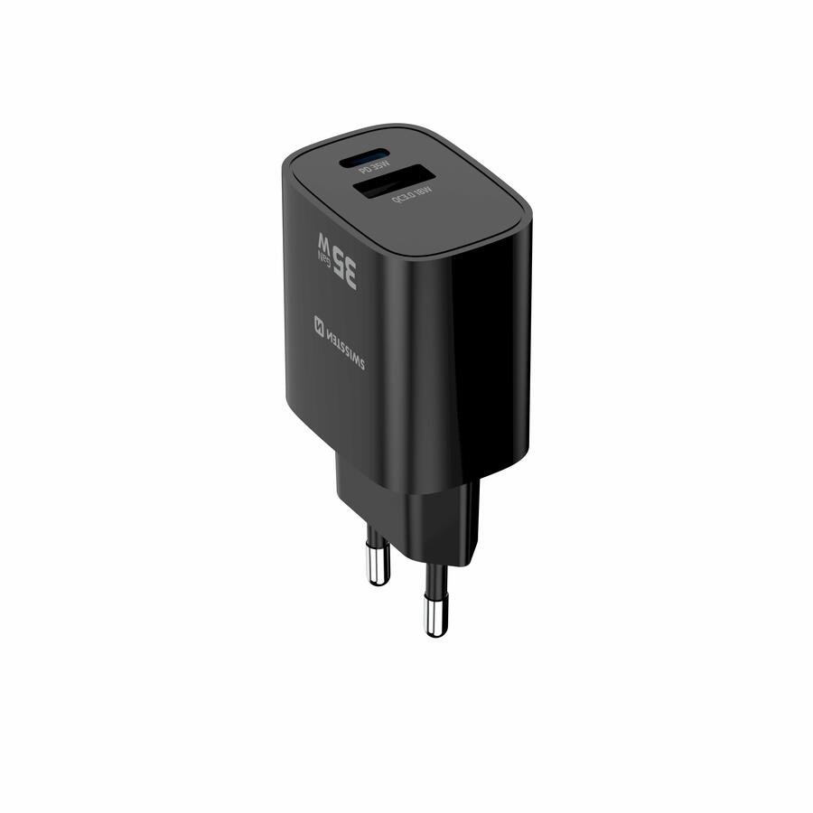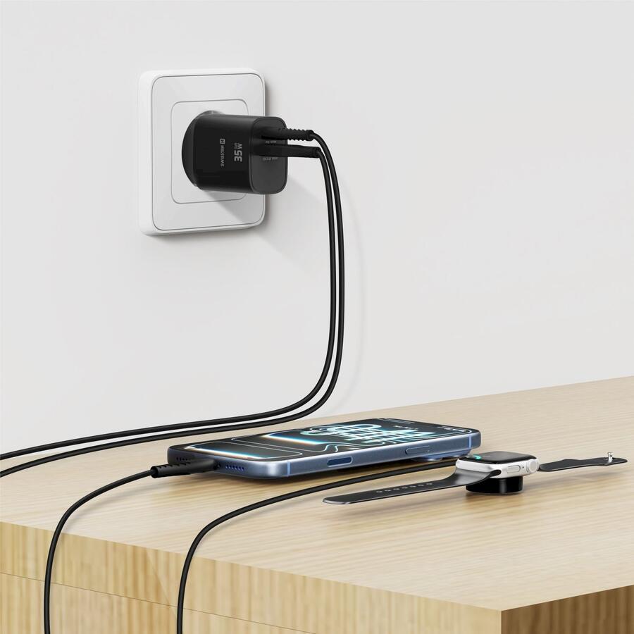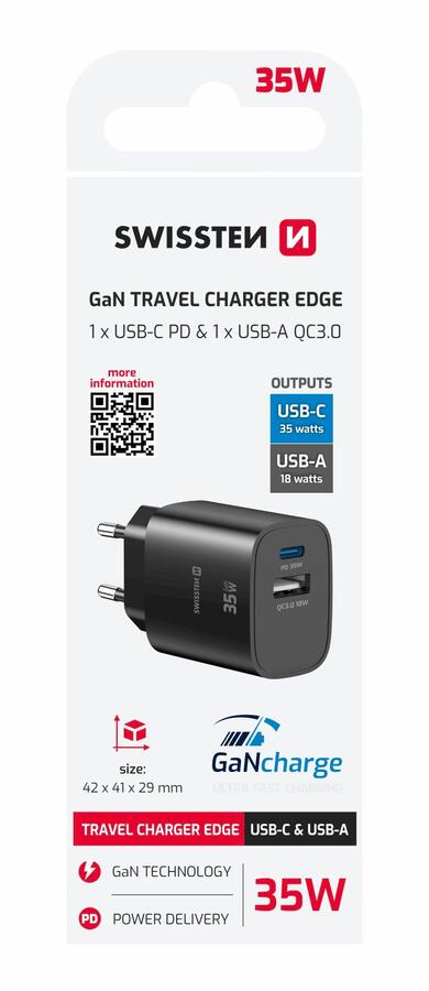 The compact SWISSTEN EDGE wall charger with GaN technology is designed for fast and efficient charging at home and on the go. The powerful USB-C port delivers up to 35W, making it suitable even for more demanding devices, while the USB-A port allows simultaneous charging of additional electronics. Thanks to its small size and low weight, it easily fits into any bag or backpack. GaN technology also ensures higher efficiency and lower heat compared to conventional chargers.