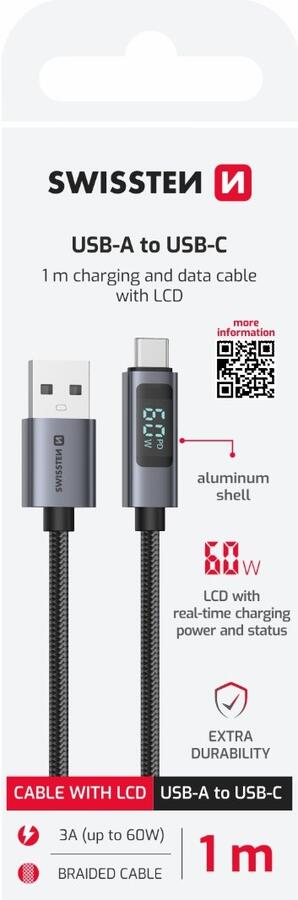 SWISSTEN LCD cable USB-A / USB-C 1 m offers a revolutionary way to keep track of your device’s charging process. The integrated LCD display instantly shows the current power in watts and indicates Power Delivery technology, allowing you to efficiently monitor charging speed.