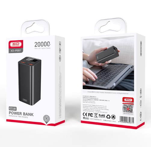 Introducing our versatile 20000mAh power bank, built to keep you powered up wherever you go, including your laptop. With a high capacity and a digital display for precise power monitoring, it's your ultimate solution for extended charging needs. Crafted with a robust ABS + PC flame retardant + aluminum alloy shell, housing a dependable lithium-ion battery. Featuring dual Type-C inputs/outputs with rapid charging capabilities and USB ports delivering efficient power output. With a total output of 60W for Type-C1, 65W for Type-C2, and 22.5W for USB1/USB2, you can combine ports for maximum output, ensuring all your devices, including laptops, stay powered up. Compact in size and lightweight, it's designed for convenience without compromising on performance. Supported protocols include PD3.0, PD2.0, PPS for USB-C inputs/outputs, and QC3.0, QC2.0, AFC, FCP, SCP, VOOC for USB-A outputs. Stay charged and connected on-the-go with our versatile 20000mAh power bank, ensuring you never miss a beat, even when you're away from an outlet.