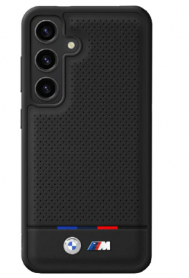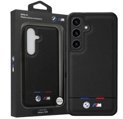 BMW Samsung S25 Case MagSafe M Perforated Tricolor Black. The surface of each cover has been made more attractive by a perforation and a three-color line in the BMW brand colors that runs through the cover - thanks to these elements, the case becomes unique and attracts attention. The use of the highest quality leather guarantees an impeccable appearance for a long time. The back of the case is additionally reinforced with polycarbonate, which increases impact resistance and protects the phone from possible damage. Flexible sides made of TPU ensure a good grip so that you can hold the phone firmly in your hand. Slightly raised outer edges protect the phone display from damage, while raised outer edges around the camera lens protect the optics from breakage or scratches.