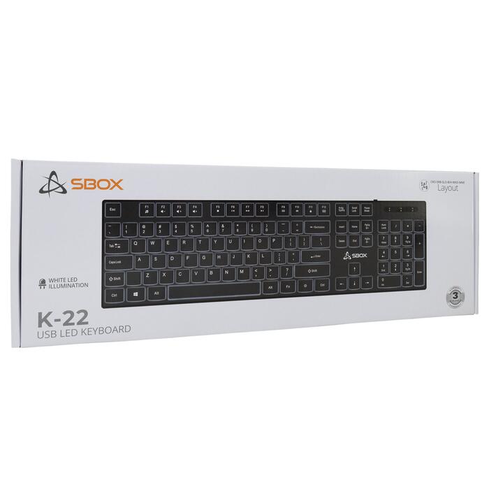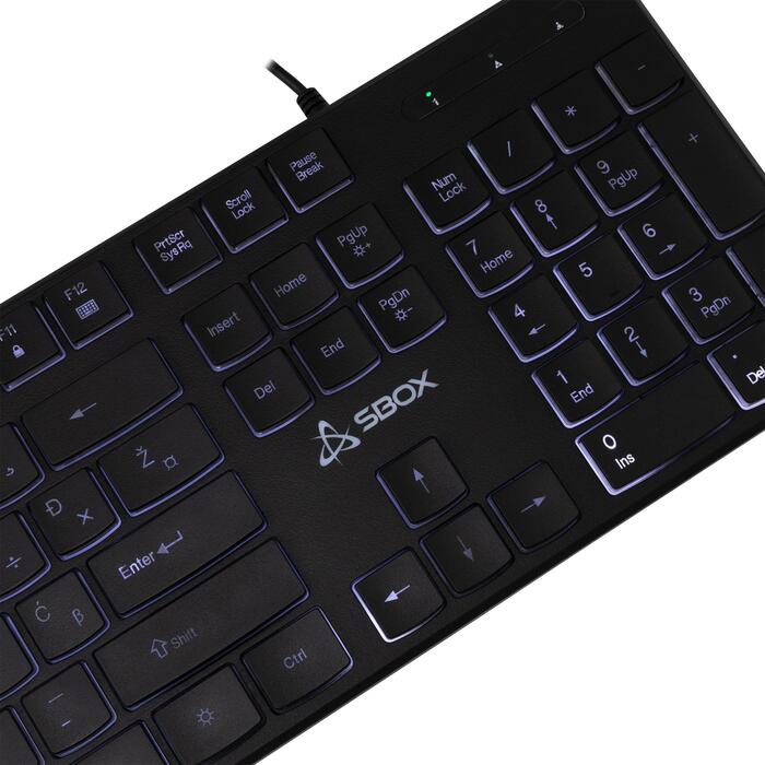 SBOX biroja tastatūra apvieno izturību ar stilu, piedāvājot pilnu izkārtojumu, membrānas slēdžus un baltu LED apgaismojumu.