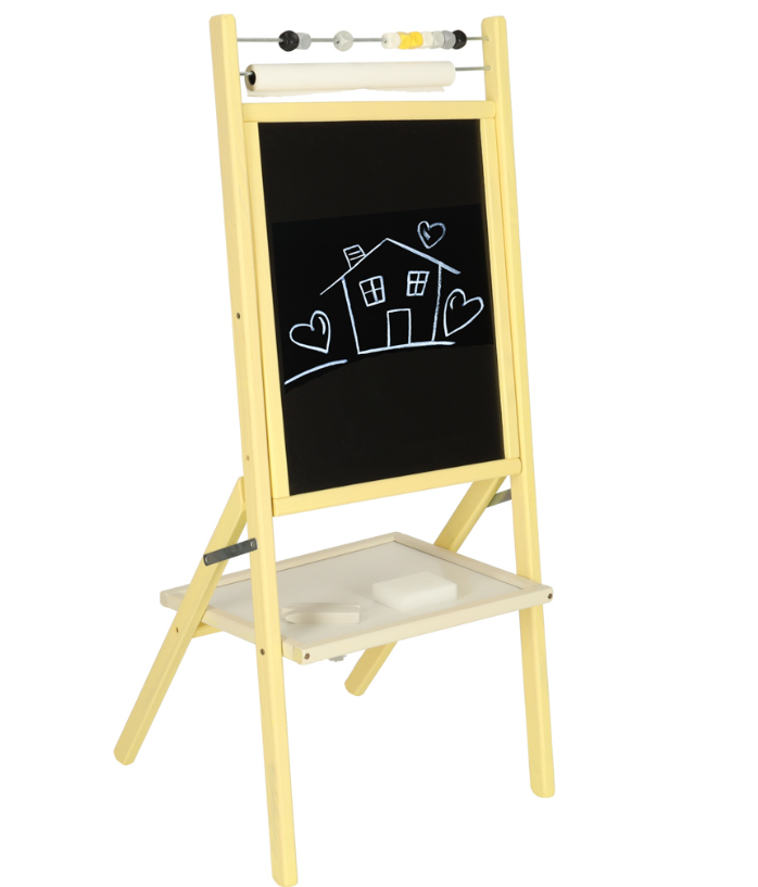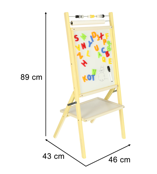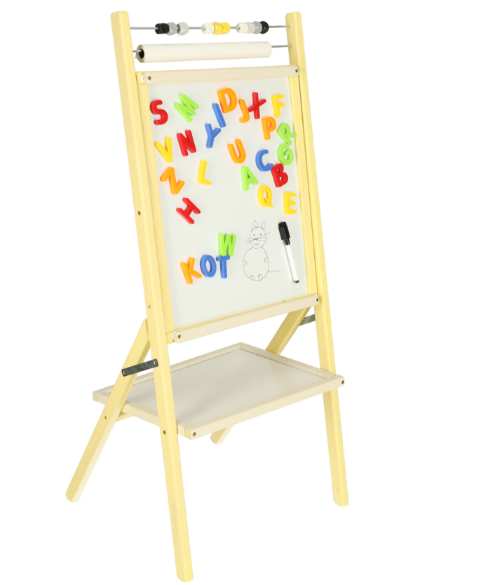 Double-sided board for children – magnetic whiteboard and chalkboard. In addition, the board has an abacus and a roll of paper for drawing. At the bottom of the board is a shelf for accessories from the set: chalk, marker and sponge. Drawing on the board develops manual skills and creativity.