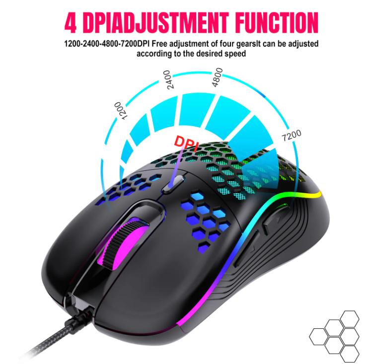 The RoGer S4 is a high-performance gaming mouse built for precision, speed, and style. With up to 7200 DPI and customizable 6-gear sensitivity settings (1200 / 2400 / 4800 / 7200), it lets you fine-tune your control for any gaming scenario. The vibrant RGB lighting adds a bold visual touch to your setup.