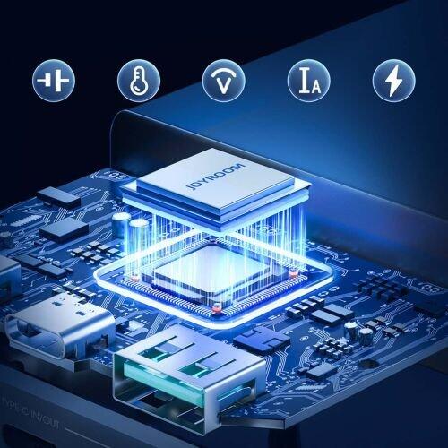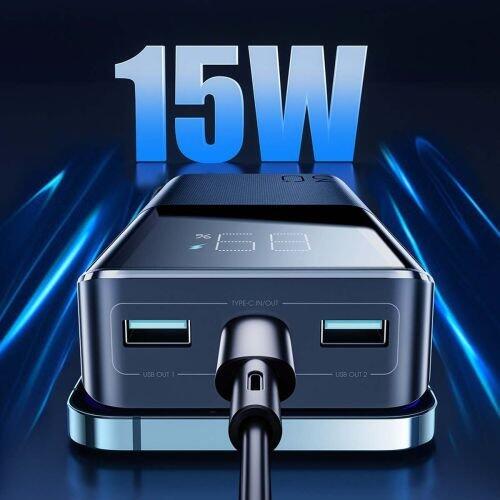 Joyroom JR-T015 is a stylish and well-finished powerbank with a capacity of 30000mAh. It is equipped with 3 output ports - two USB Type A and one Type C (it can also act as an input port), and a microUSB input port. The JR-T015 Power Bank is made of high-quality ABS and fireproof PC. It also has a large display that shows the remaining charge level. There were also sensors, such as: anti-overvoltage, anti-overload, anti-voltage.
