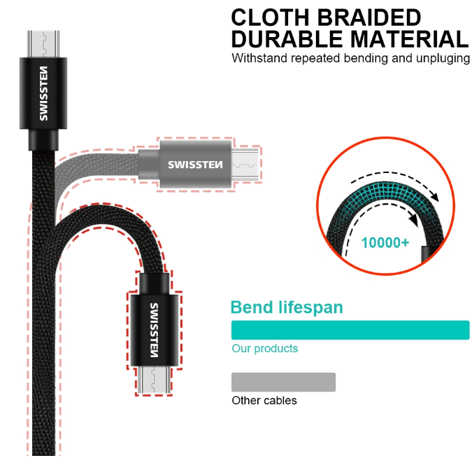 High quality textile data cable USB / Micro USB with length of 1,2 m. The cable reinforced to deliver a higher current (up to 3A) and can handle fast 480 Mb/s data transfer. Packed in Swissten retail pack.