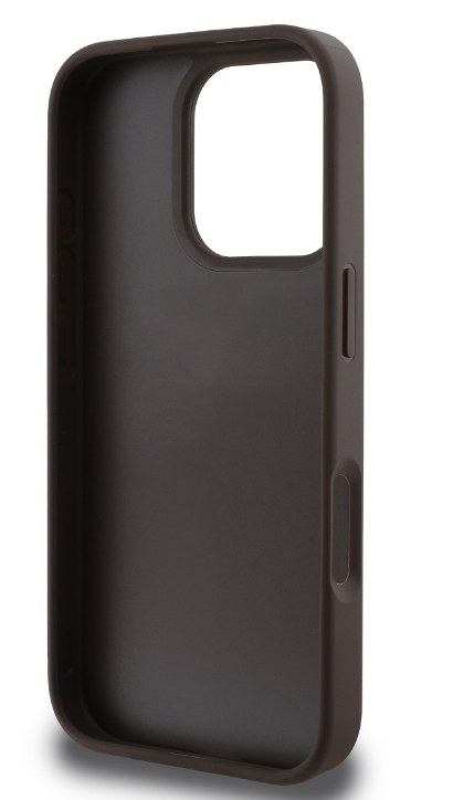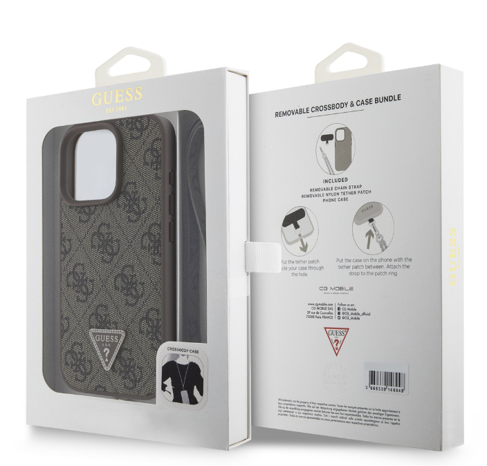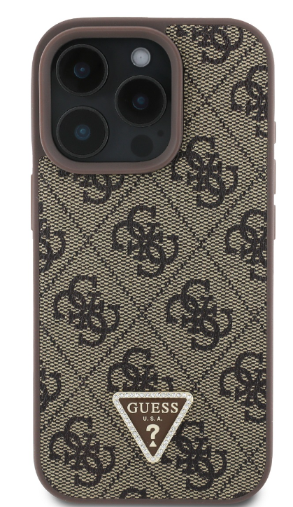 The premium Guess PU 4G Strass Triangle Metal Logo back cover features an elegant, signature 4G pattern, complete with a golden GUESS triangle logo.