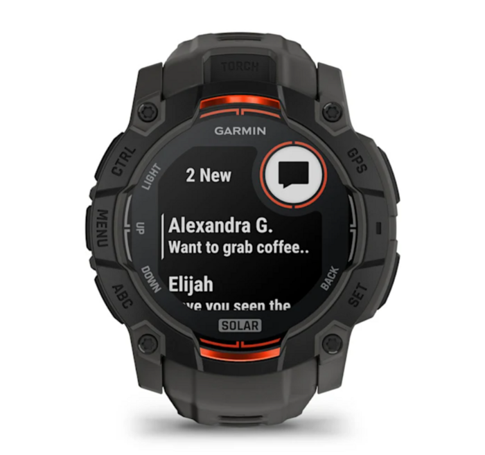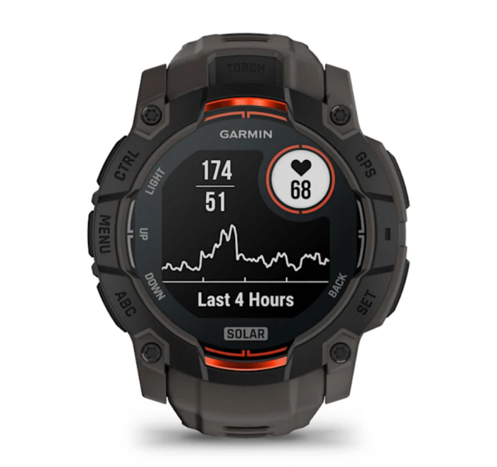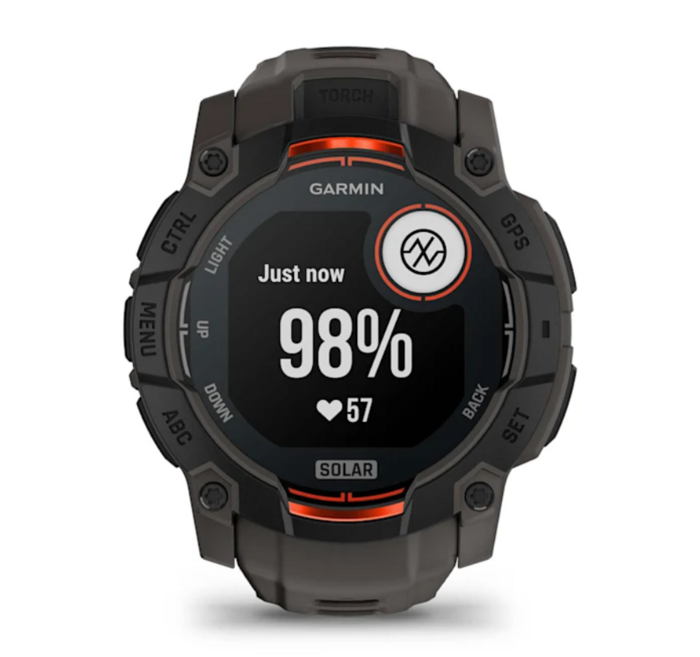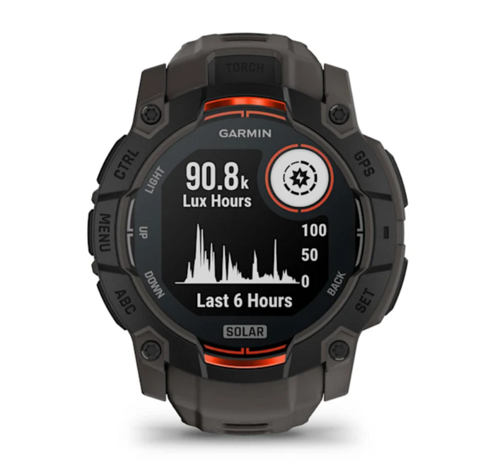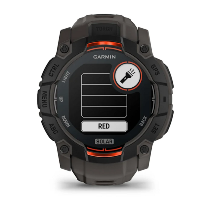 | Īpašas piezīmes | Saules uzlāde: neierobežots akumulatora darbības laiks optimālos apstākļos (pieņemot, ka ierīce tiek nēsāta visu dienu, 3 stundas dienā ārā 50 000 luksu apgaismojumā); iebūvēts lukturītis: integrēts LED lukturītis ar maināmu intensitāti un zibspuldzes režīmiem redzamībai vājā apgaismojumā |