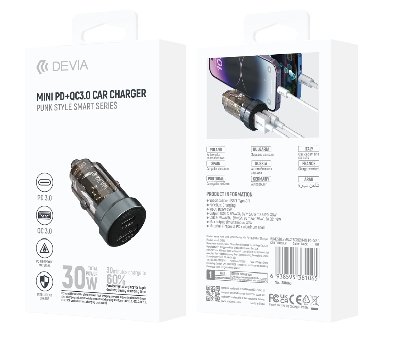 Devia Smart Punk is a car charger with two USB A QC 3.0 / USB-C PD sockets, to which you can connect an appropriate cable for charging mobile devices.