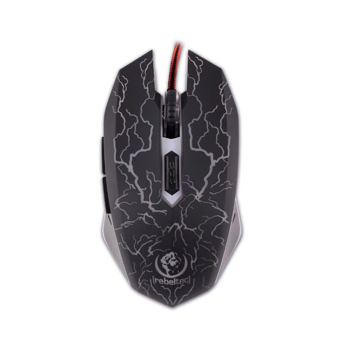 Sunplus 168DPI sensor: 800 / 1200 / 1600 / 2400 DPI, 6 buttons and scroll wheel, backlit and rubberized, weight 135g, Teflon feet, acceleration 5G, refresh rate 3000 frames/s, LED lighting: red.