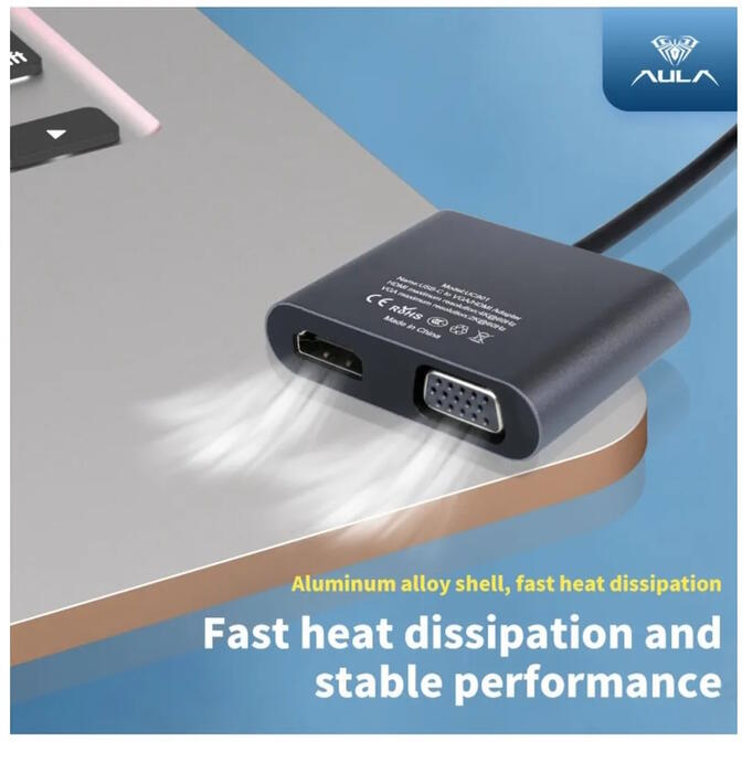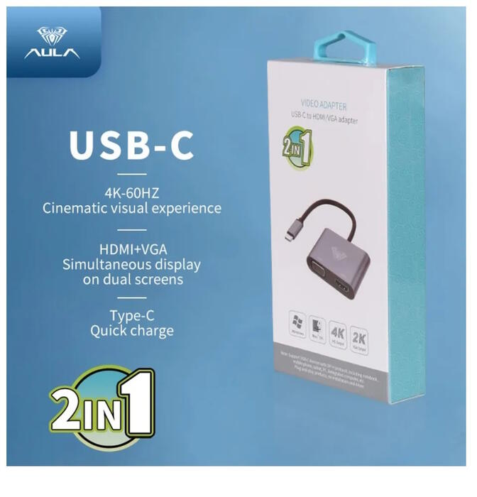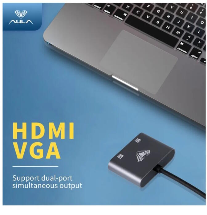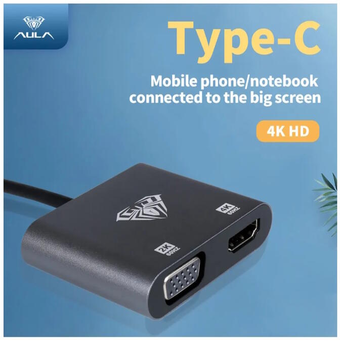 Aula UC-901 - 2x USB-C adapter - Transition. This is a video signal adapter that provides the transition from USB-C to HDMI 4K 30Hz and VGA standard monitor window cable connection. With this adapter, it will be easy to connect to the latest MacBooks, for example, a standard monitor with a VGA connection, or another video device with a standard HDMI connection, such as a TV, Projector, Monitor or something else. Versatile, small and compact to take with you on a trip or outing with your laptop. The Aula UC-901 can also be used to connect to a mobile phone or tablet that has the appropriate video connection support.