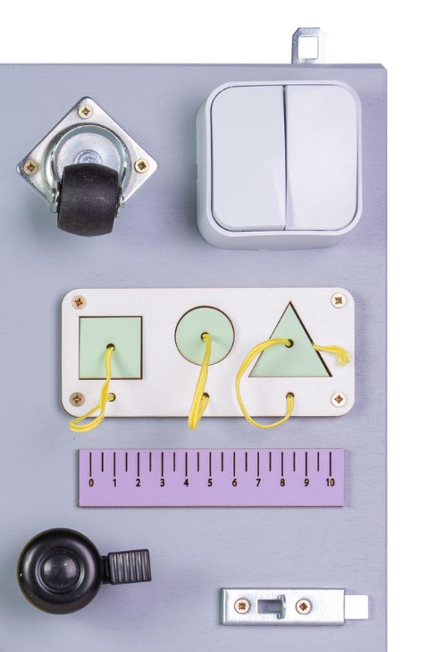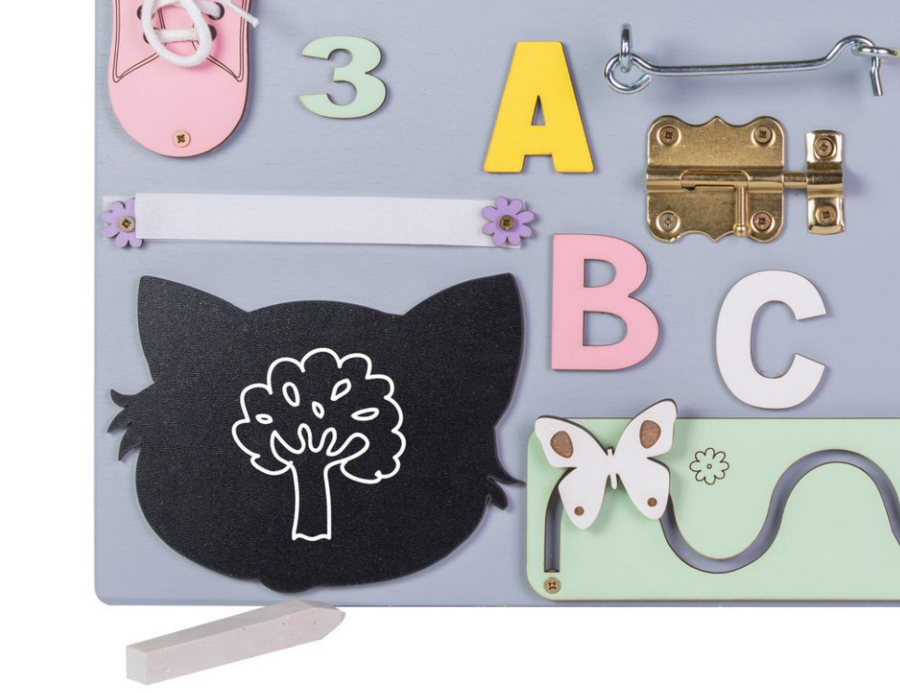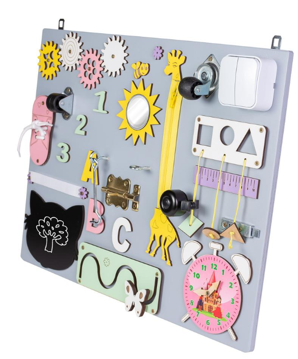 A wooden handling board that supports children in a safe and friendly exploration of the world. Thanks to various elements, for example, a light switch, sliders or a lightning lock, children satisfy their innate curiosity. Material: wood. Dimensions: 50x37, 5 cm