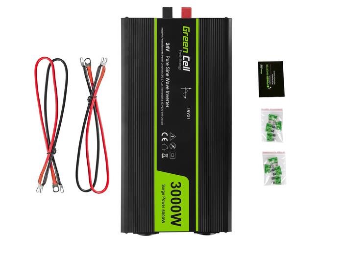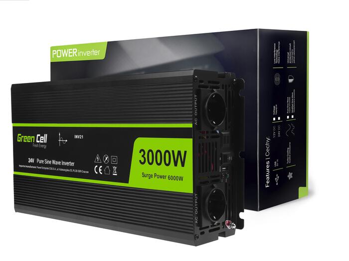Garantija: 24 mēneši; Krāsa: melna; Pārkaršanas aizsardzība: Izstrādājuma kods: Ražotājs: INV21; Izgatav: Ražotājs: Green Cell; Pārsprieguma aizsardzība: Pārsprieguma indikators: Jā; Indikators: Izejas spriegums: 24V DC; Izejas spriegums: 230V AC; Izejas frekvence: 50Hz; Izejas sprieguma forma: Izmantojamā jauda (nepārtraukta): 3000W; Īslaicīga jauda (impulsa): 6000W