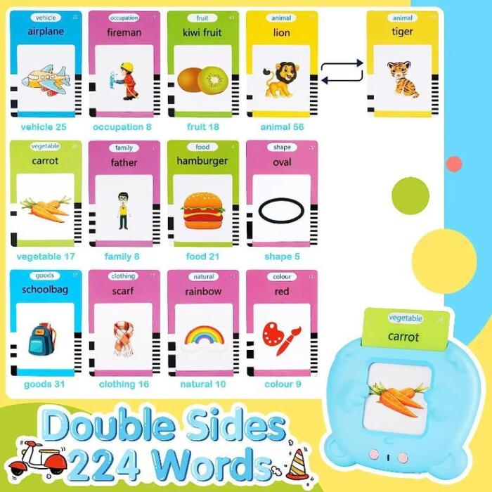 An interactive electronic card reader for learning English is an excellent way to spark children’s curiosity about the world and their desire to learn English. The toy not only provides entertainment but also educates, integrating learning with play, which is a very effective method of learning, especially for younger children. Through this form of play, the child develops memory and concentration and supports logical thinking and creativity.