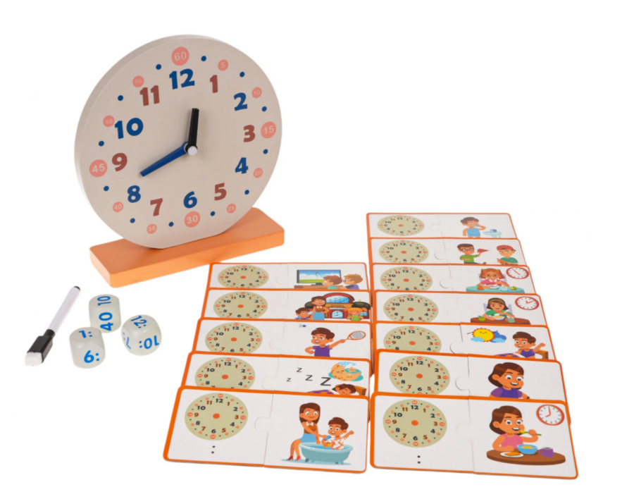 Educational set with a clock and accessories for children over 3 years of age. The set includes a large wooden clock with movable hands, 3 dice, 24 elements for assembly and a marker. With this set, a child will learn to use a watch, will train memory, concentration and perceptiveness. On the large wooden clock, you can move the hands of the clock, reading the time, we can also instruct the child to arrange a specific hour from the hands. Instead of Arabic numerals, the dice have hours, on one dice from 1 to 6, on the second from 7 to 12, and on the third minutes from 00 to 50 minutes. The child can throw the dice and then arrange a specific time on the clock. The set also includes double-sided elements for assembly. On one side we have a clock, and on the other side the child must attach an element with the correct time. On the other side of the puzzle we have pictures with specific activities, and the child will have to draw the time of performing a specific activity on the clock.
