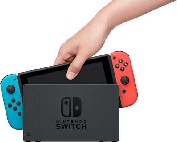 Neona sarkani un neona zili Joy-Con kontrolieri, noņemami vairāku spēlētāju izklaidei.