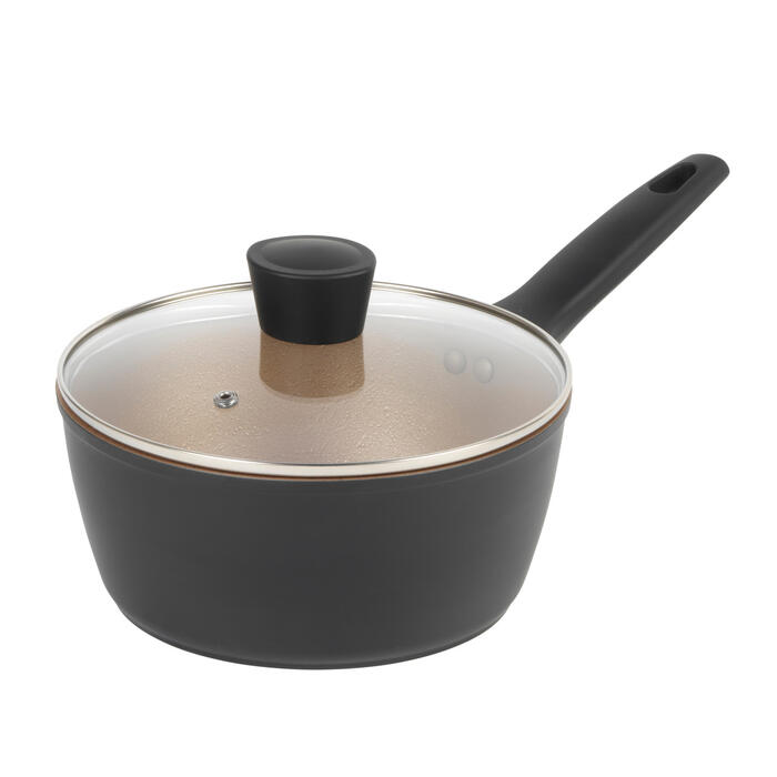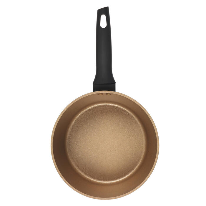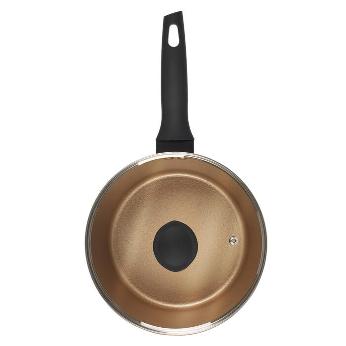 - Elegantais katliņš ir izgatavots no izturīga, kalta alumīnija, un tam ir zelta krāsas Crystaltech nepiedegošais iekšējais pārklājums.