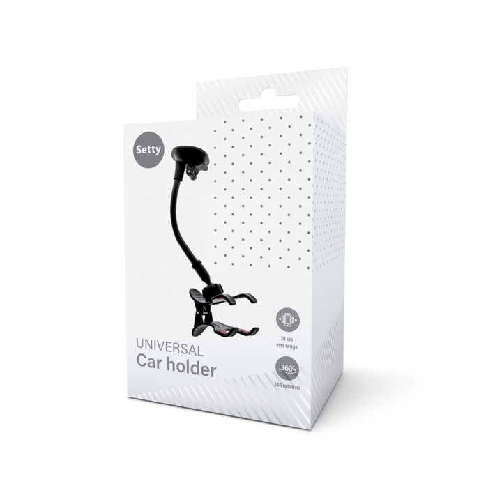 Specially designed Setty bracket allows you to access the smartphone function while driving. You can fasten it to the glass and set any angle to ensure perfect visibility. Universal clip fits most smartphones, the span of the handle is about 11.5 cm, while the length of the handle is 20 cm. The universal Setty handle has a rotating head, so we can set the smartphone in both horizontal and vertical position.