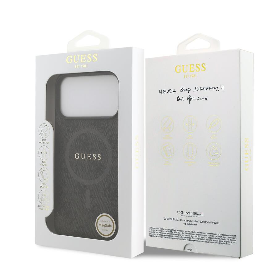 The Guess PU Leather 4G Colored Ring MagSafe Back Cover is the perfect accessory for your phone and your outfit, combining functionality and style in one. It is made of light and durable PU artificial leather and offers great protection for your phone as well as comfort in use. The surface treatment of the cover ensures that it holds well in the hand and does not slip, which minimizes the risk of the phone slipping out. Thanks to the precise shape, it fits perfectly on the phone and allows easy access to all buttons and connectors. This case supports MagSafe technology, which means it is compatible with wireless charging and other MagSafe accessories. Guess "4G" elegant print and metal logo offer not only a discreet but also a luxurious look. So if you are looking for a cover that combines elegance and functionality, this piece from Guess is the right choice for you.