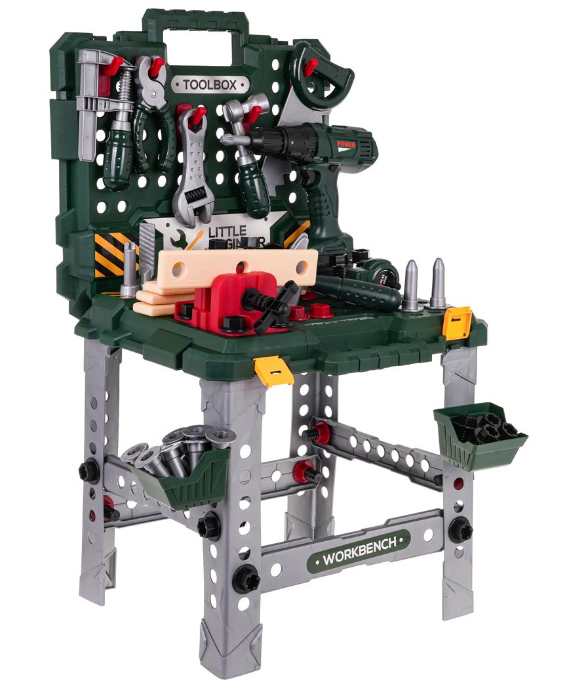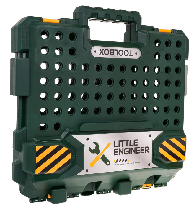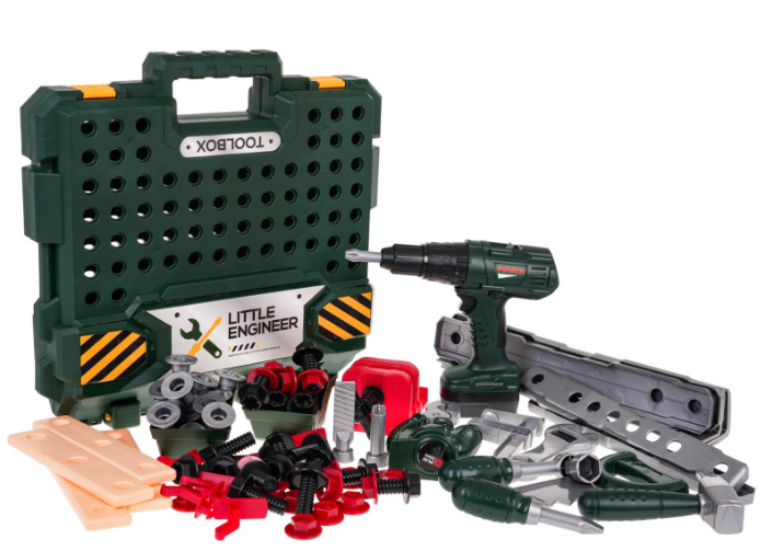 This richly equipped 2in1 DIY Tool Kit is designed for children ages 3 and up, offering an interactive, hands-on experience with a battery-powered drill-driver that actually screws and unscrews! Made from high-quality plastic, the set contains 98 pieces and includes everything your little builder needs to create both a workbench and a tool case.