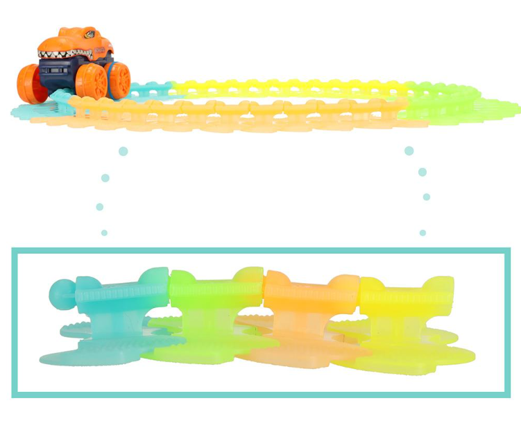 Thanks to the lights in the car, playing with the track will be something fantastic even at night. As soon as the car starts on the built track, its lights leave a glow. And the fluorescent path will emit soft light. The kit includes one base of the toy car, but up to two bodies to choose from - so your child can quickly change the look of your toy car. In addition, the attached stickers will help to give the car a unique character. The car holds perfectly on the track - even when driving uphill! Thanks to this, the track can take many different forms, because a small but fast car will surely run over any construction site! Building a track will guarantee you a lot of fun, but it will also allow you to develop your manual skills - connecting cubes will require accurate fingers and good eye-hand coordination.