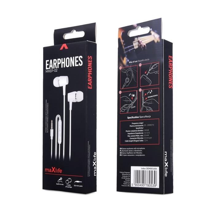 Maxlife wired earphones. Take your favorite music on every trip. Comfortable earbuds provide a perfect fit and comfort during use, a 1.2 m long cable will allow you full freedom and controller with a built-in speaker will let you talk on the phone while your hand is full.