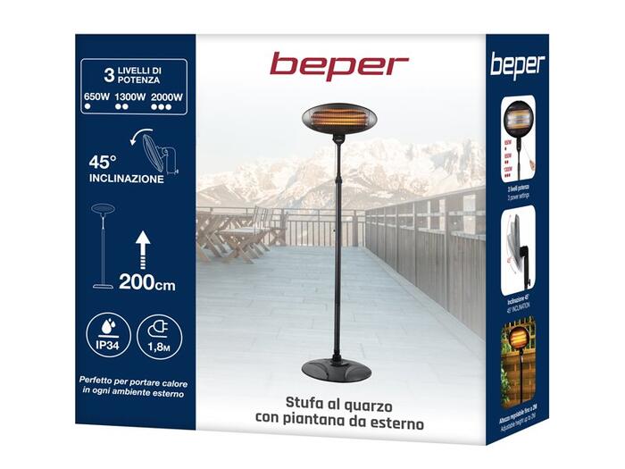 Izstarojošais panelis ar kvarca sildelementiem, lieliski piemērots sildīšanai jebkurā āra vidē. Grīdas statīva augstums regulējams līdz 2 m un smaga apaļa pamatne maksimālai stabilitātei, grīdas stiprinājuma komplekts maksimālai drošībai. 3 jaudas/siltuma iestatījumi, kurus var izvēlēties, izmantojot pavelkamu slēdzi, un regulējams slīpums, lai virzītu siltumu.