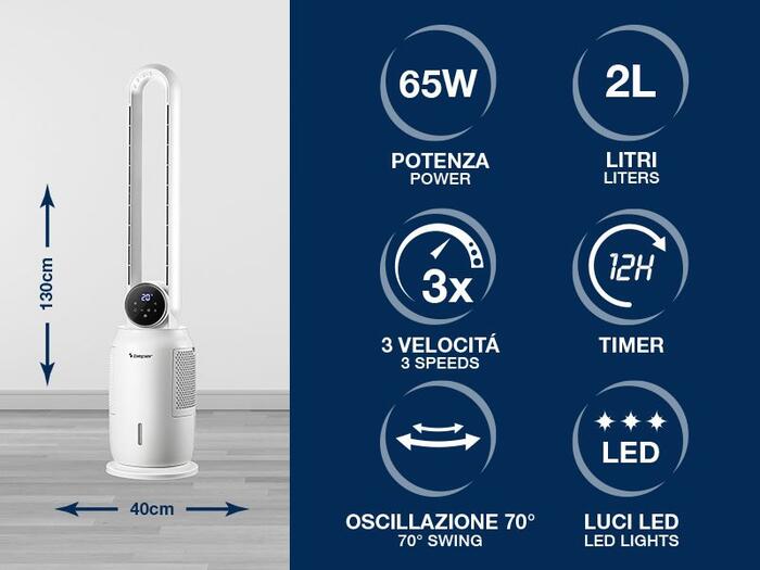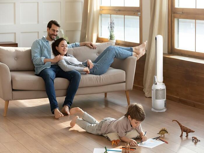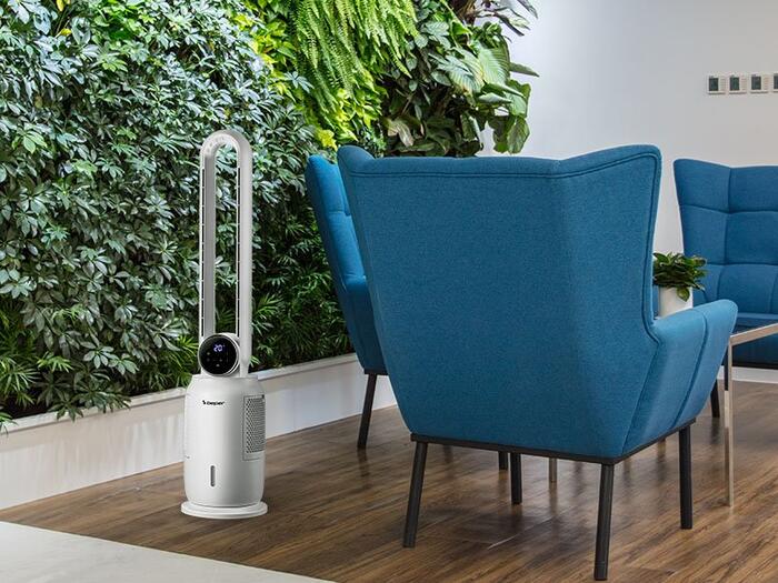 Torņveida ventilators ar modernu dizainu un inovatīvu tehnoloģiju bez lāpstiņām labākai un efektīvākai gaisa plūsmas sadalei.