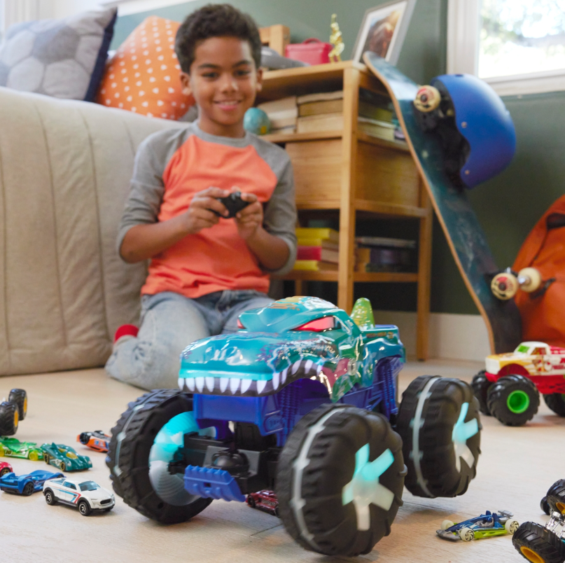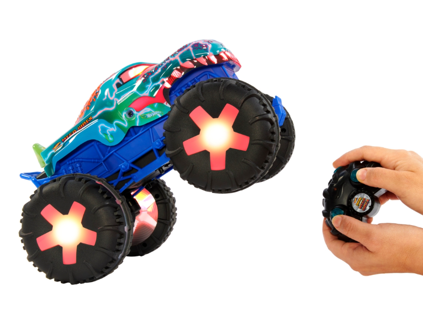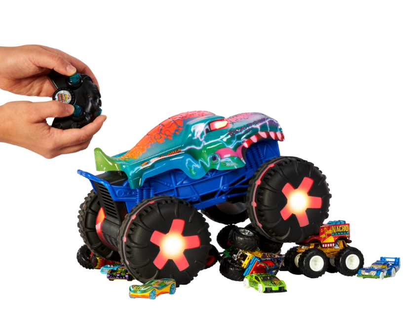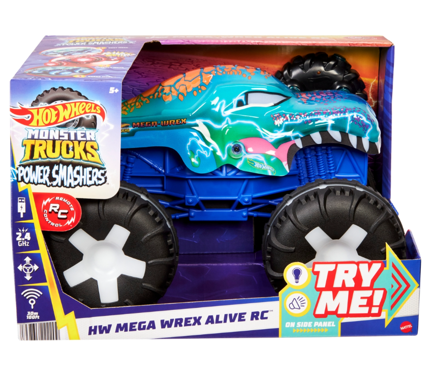 • The Hot Wheels Monster Trucks beast Mega-Wrex comes alive in an oversized remote-control vehicle with interactive lights and sounds.