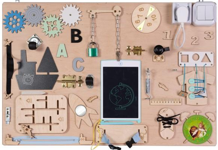 A hand-held board that supports children in a safe and friendly exploration of the world. Thanks to various elements, for example, a light switch, sliders or a socket with a plug, children satisfy their innate curiosity. Material: wood. Dimensions: 75 x 50 cm.
