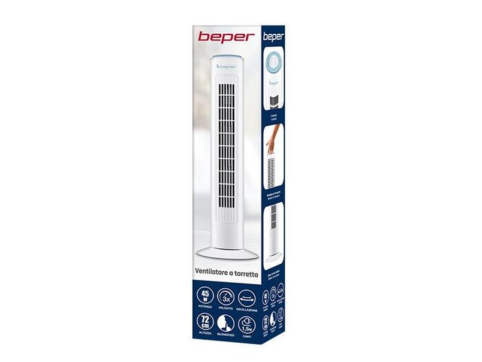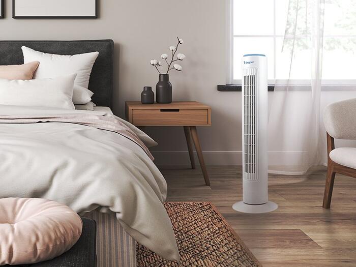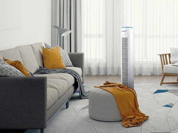 Torņa ventilators ar ABS struktūru un stabilu pamatni.