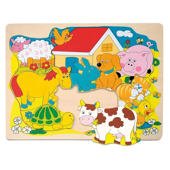Woody 90340 - Eco wooden puzzles of 10 figures of different animals that need to be put in the base-frame, in which there are made special recesses for each animal. Made from very high-quality ecological Wood and safe painting materials for kid’s health. This toy develops the child's hand motility and logical thinking. This toy is for every child, both boys and girls.