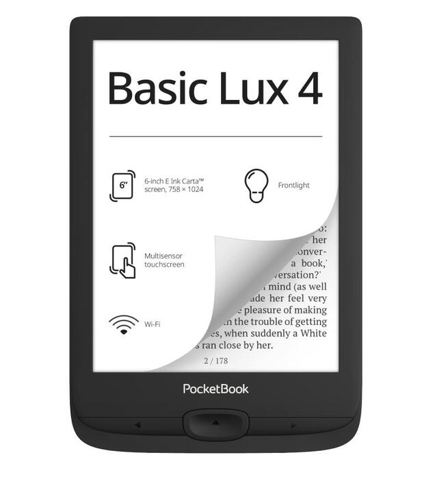 Model name Basic Lux 4 | Screen size 6" | Touchscreen | Native resolution 1024x758 | Storage capacity 8GB | 1xUSB-C | Memory Card Type Micro SD | Wireless LAN | Colour Black | Dimensions 108 × 156 × 7,35 mm