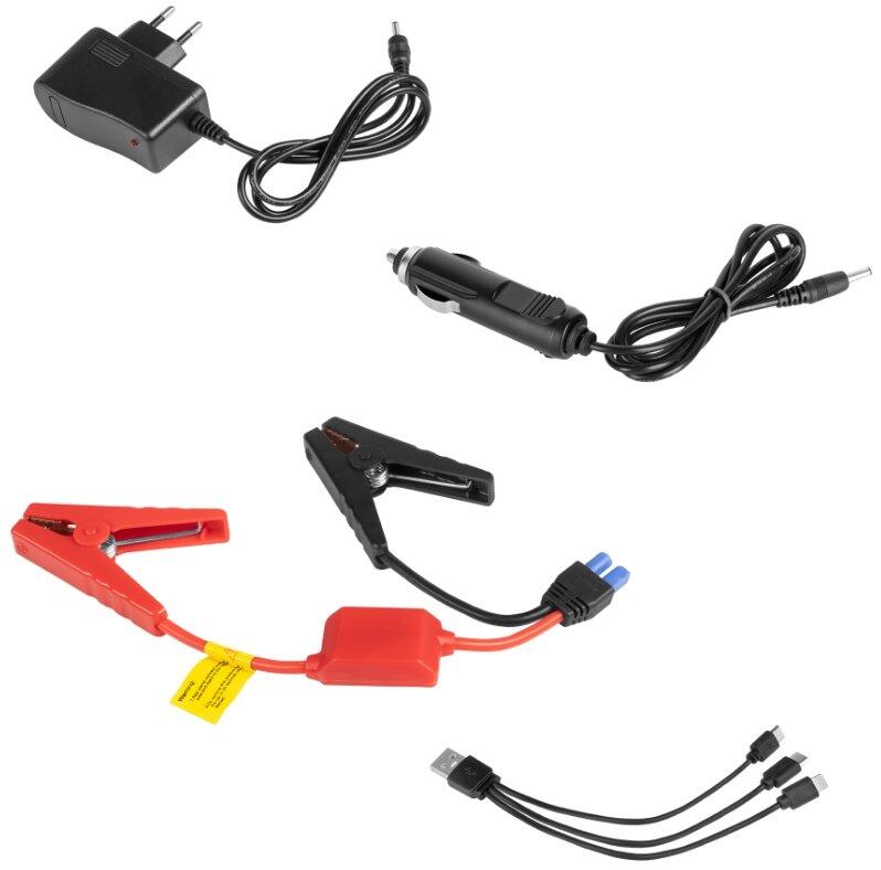 Komplektā ietilpst: džemperu kabeļi, 3 vienā kabelis (Micro USB, USB-C, Lightning), automašīnas lādētājs, tīkla lādētājs, lietotāja rokasgrāmata