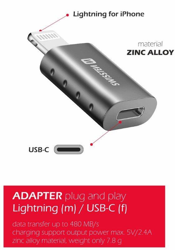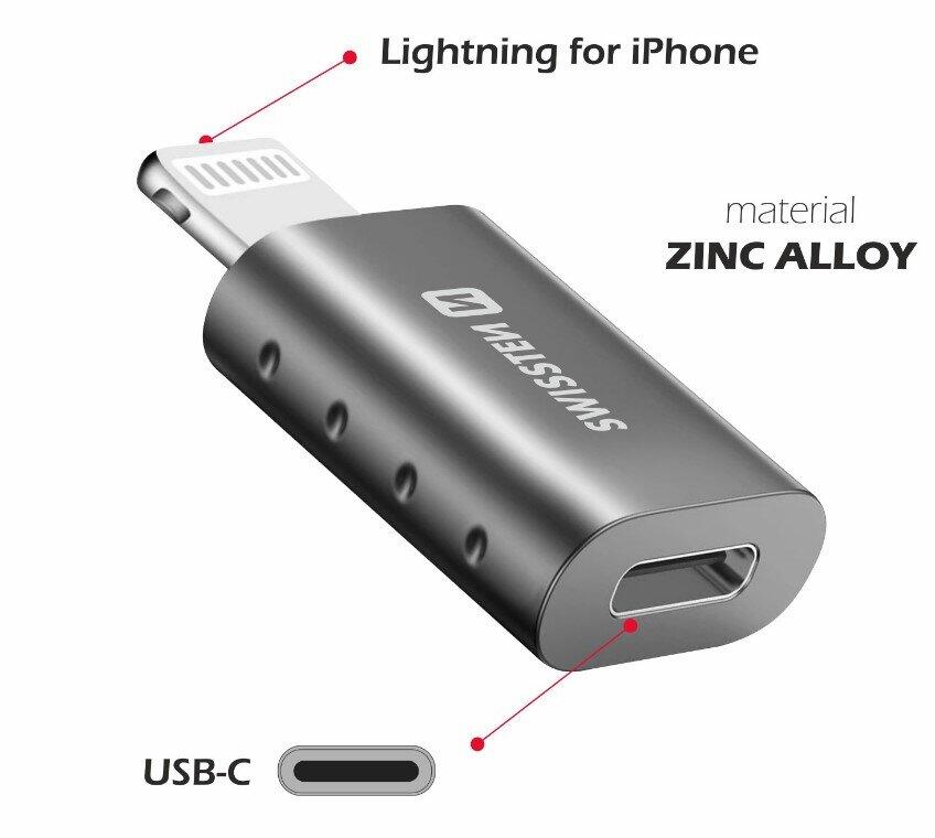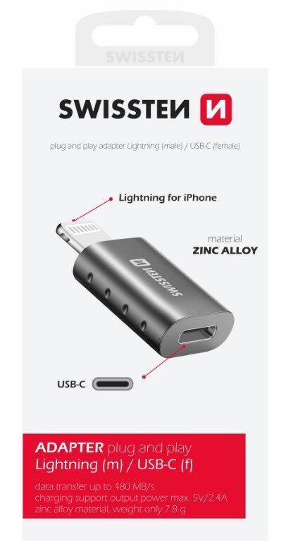 SWISSTEN ADAPTER LIGHTNING(M)/USB-C(F) tiek izmantots ierīces ar USB-C savienotāju savienošanai ar iPhone ierīci. Iepakots SWISSTEN mazumtirdzniecības iepakojumā.