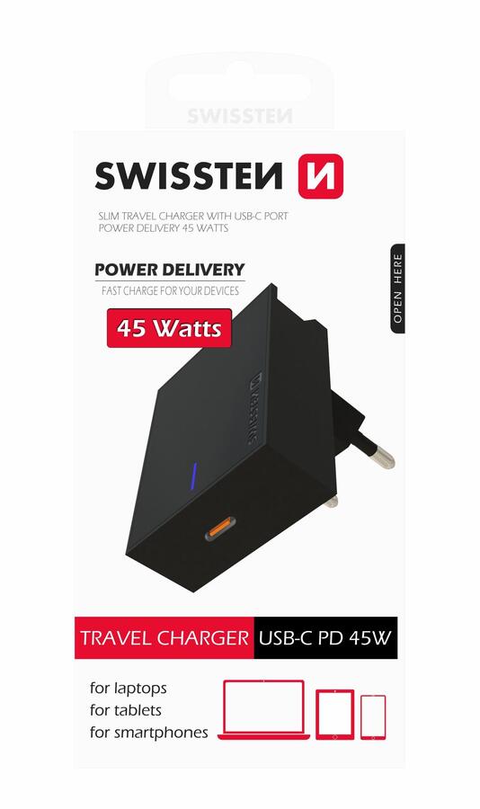 Unikāls SLIM ceļojumu lādētājs ar USB-C izeju, 45 W jaudu un POWER DELIVERY tehnoloģiju (iPhone 8 un jaunāku, iPad, Macbook datoru uzlādēšanai). Varat izmantot viedtālruņa statīvu lādētāja augšpusē. Iepakots SWISSTEN mazumtirdzniecības iepakojumā.