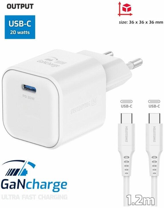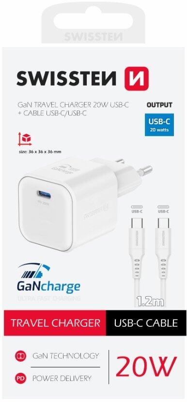 Swissten Tīkla Lādētājs GaN USB-C 20W PD + Datu kabelis USB-C-USB-C 1.2m
