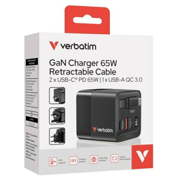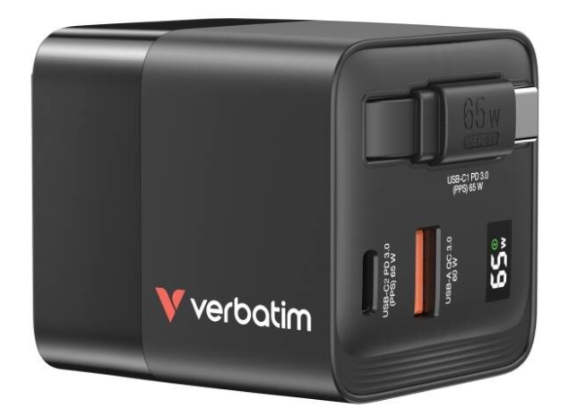 Verbatim 32217 GaN Tīkla Lādētājs 65W 2x USB-C / USB-A + Adapteris
