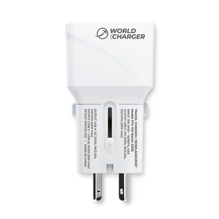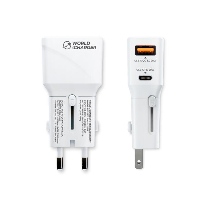 prio Fast Charge World Travel Charger 20W PD (USB C) + QC 3.0 (USB A) balts