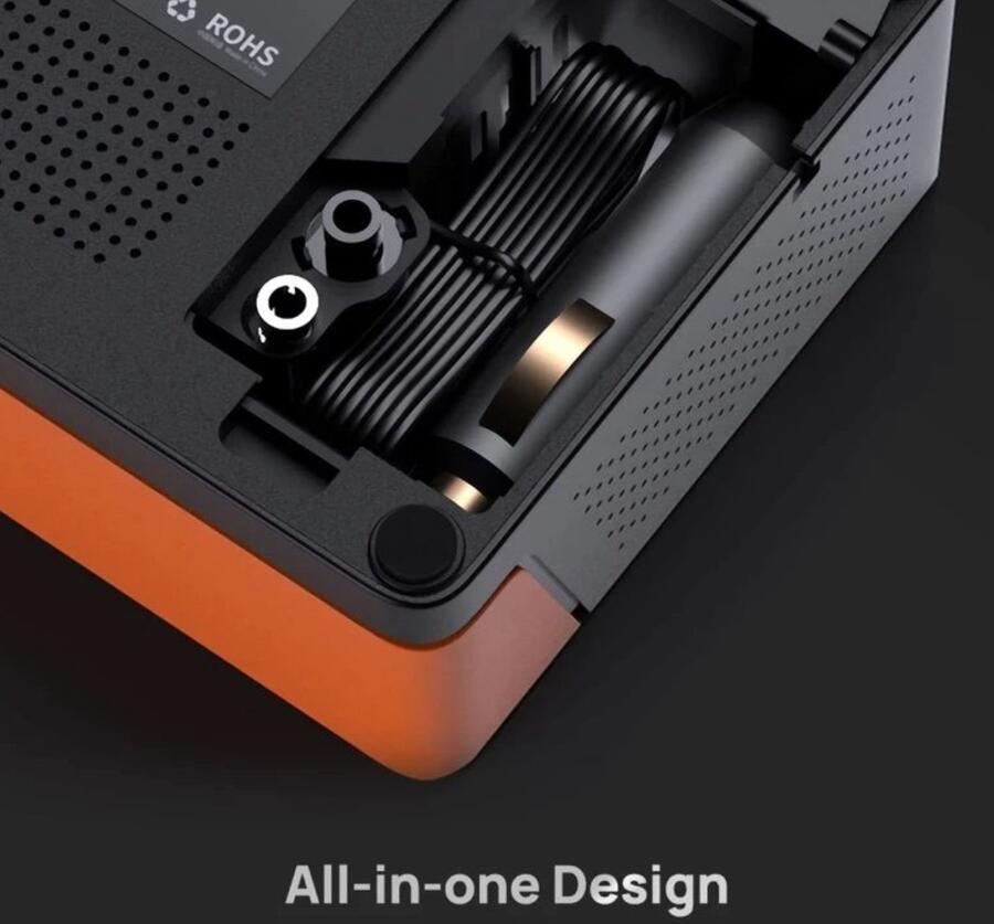 Kompresoram ir iebūvēta lampa, tas aprīkots ar iebūvētu šļūteni (1 m) ar galu kopējiem vārstiem uz automašīnas, motocikla, velosipēda, bet arī uz skrejriteņa.