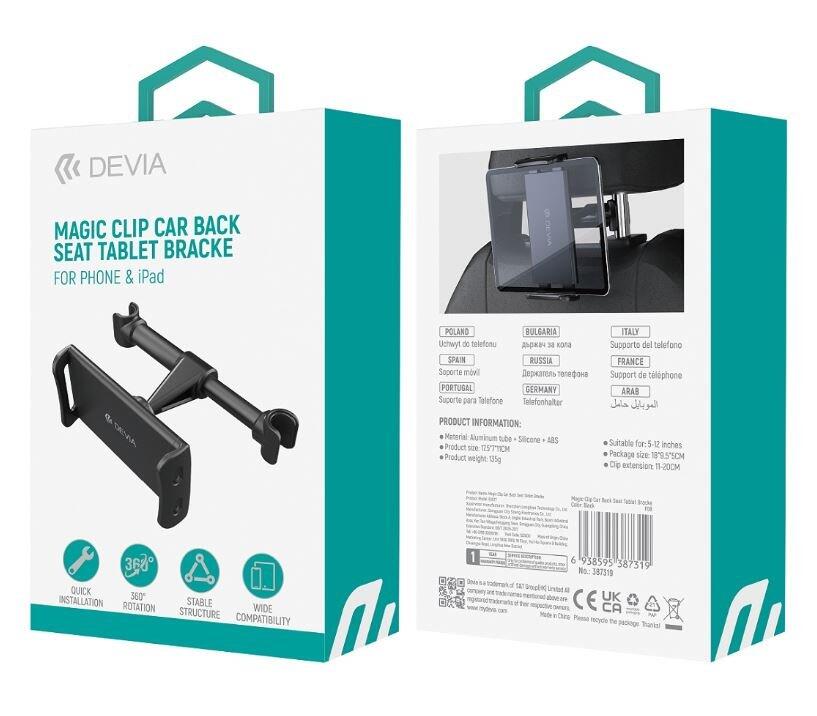 Devia Magic Clip ir universāls automašīnas sēdekļa galvas balsta turētājs. Tās roku atstatums ļaus ērti izmantot viedtālruni vai planšetdatoru automašīnā, tāpēc katram aizmugurējā sēdeklī esošajam pasažierim būs ērtāks ceļojums.