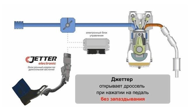 JETTER parveido signalus no droseles pedala stavokla sensoriem ta, lai nodrosinatu "cietu" savienojumu starp droseles pedala stavokli un droselvarstu, noversot ta atversanas aizkavesanos. Droseles varsta atversana bez aizkaves lauj dzineja cilindra ievadit vairak darba maisijuma agrak neka standarta versija, kas lauj atrak sasniegt lielaku griezes momentu un jaudu. Tas savukart uzlabo paatrinajuma dinamiku. Atlaizot akseleratora pedali, droselvarsts nekavejoties aizveras, tapat ka standarta versija. Bez apkopes.