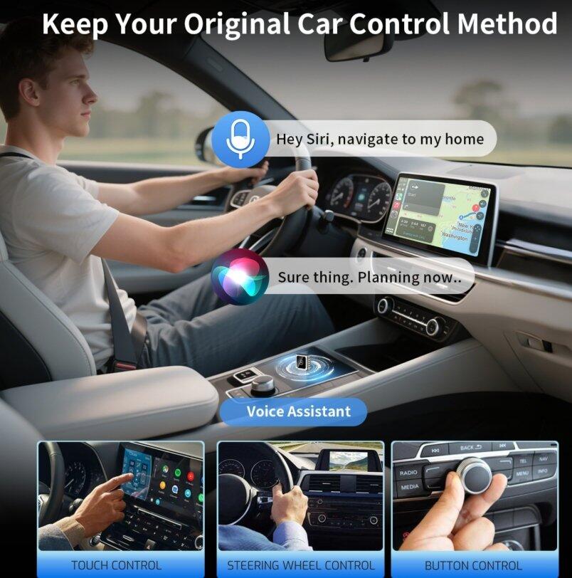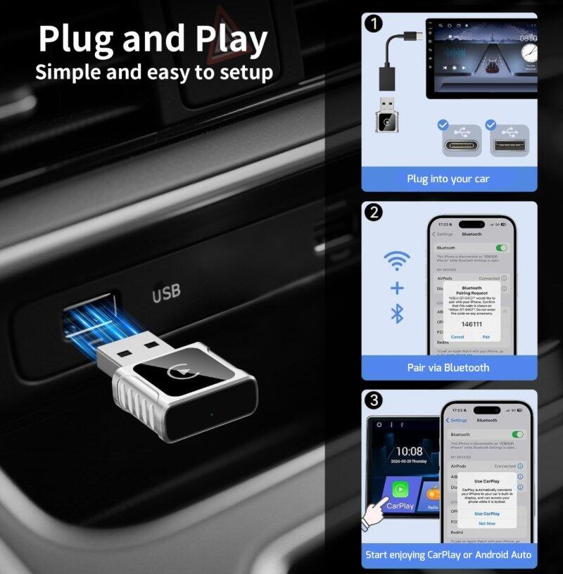 Vienkārši pievienojiet to transportlīdzekļa USB portam, un dažu sekunžu laikā varēsiet bezvadu režīmā izmantot visas CarPlay vai Android Auto funkcijas.
