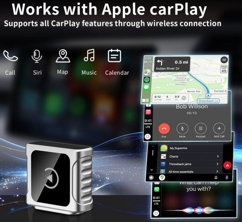 Atbalsta 98% transportlīdzekļu ar vadu Apple CarPlay vai Android Auto un darbojas ar iOS 10+ un Android 11+.