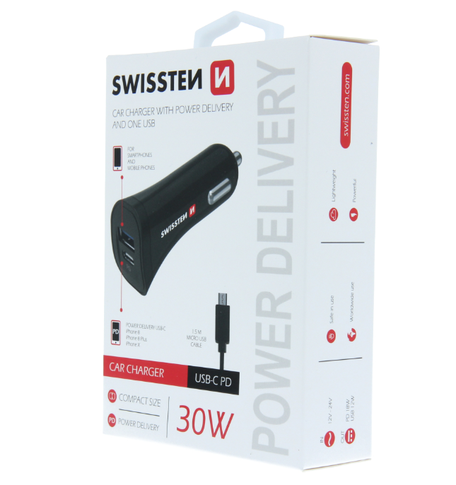 Swissten Power Delivery Auto Lādētājs 12 / 24V / 2.4A / 30W + Micro USB vads 1.5m