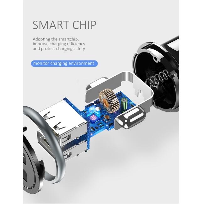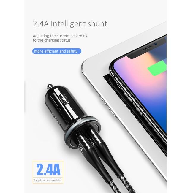 2400 mA Output voltage: DC 5 V Size: 51 x 52 x 27 mm Material: PC Alluminum Alloy Package: Blister Box Producer: USAMS Type of charger: CAR - Power 12-24V DC Socket Type of Plug: USB - 2x