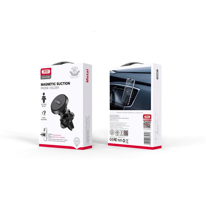 XO C122 ir universāls magnētisks turētājs automašīnas ventilācijas režģim. Tā mazie izmēri lieliski iederēsies jebkurā telpā. Komplektā ietilpst metāla uzlīmes.