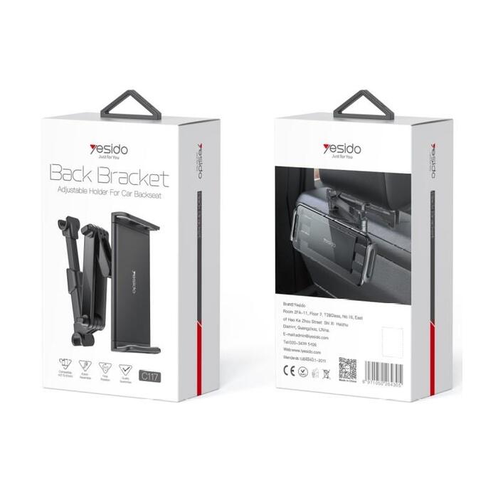 YESIDO zīmola automašīnas pagalvja stiprinājums apvieno augstākās kvalitātes materiālus un funkcionalitāti. Tas izmanto saspiešanas spēku, lai nostiprinātu ierīci un nodrošinātu saderību ar tālruni/tableti. Iekšpusē turētājs ir papildināts ar silikona spilventiņiem, kas vēl vairāk aizsargā mūsu ierīci, pasargājot to no skrāpējumiem un kritieniem. Maksimālais attālums starp rokturiem ir 278 mm, tāpēc C117 ir ļoti universāls.
