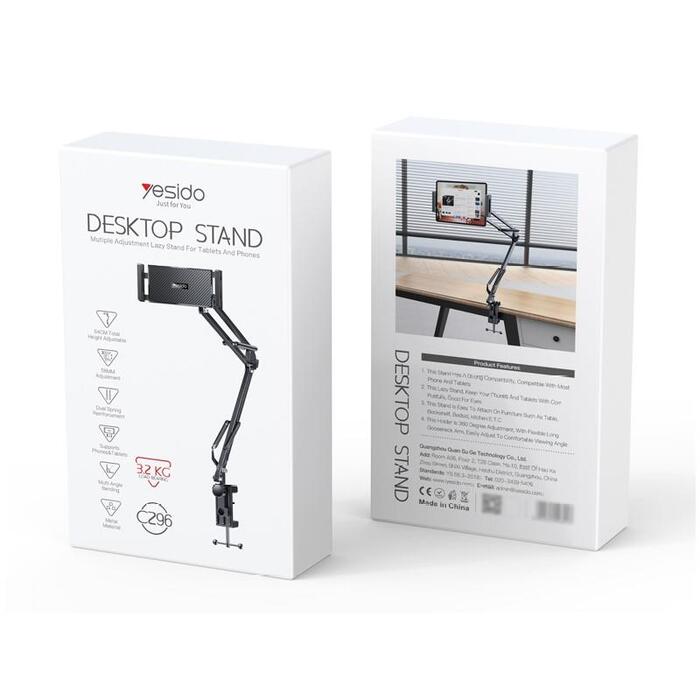 Yesido zīmola galda stiprinājums C296 ir izgatavots no augstas kvalitātes alumīnija sakausējuma un tērauda, kas nodrošina konstrukcijas vieglumu, izturību un izturību. Trīs pakāpju regulēšana ļauj pielāgot augstumu un palielina funkcionalitāti. Maksimālais augstums 64 cm ļauj ērti lietot ierīces sēdus vai guļus stāvoklī. Stiprinājumam ir universāla montāža ierīcēm ar izmēru no 4 līdz 12,9 collas.