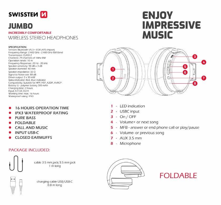 Swissten Jumbo – neticami ērtas bezvadu stereo austiņas