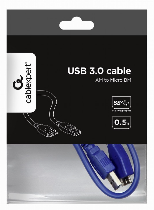 Gembird CCP-mUSB3-AMBM-0.5M ir 0,5 metru garš USB 3.0 kabelis, kas paredzēts ārējo ierīču, piemēram, mobilo telefonu, digitālo kameru un MP3 atskaņotāju, pievienošanai datora USB portam. Tas ir aprīkots ar USB 3.0 Type-A vīriešu un Micro-USB 3.0 Type-B vīriešu savienotājiem ar 9 kontaktiem. Kabelis nodrošina datu pārraides ātrumu līdz 4,8 Gbps un ir saderīgs ar USB 2.0 ierīcēm. Ekranējums samazina elektromagnētiskos traucējumus, un 30 mikronu zelta pārklājuma kontakti nodrošina uzticamu signāla pārraidi un izturību pret koroziju. Kabelis ir zilā krāsā.